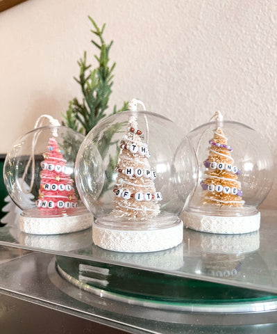Plastic snow globe, includes a packet of faux snow to add once you receive your ornament. *DO NOT add liquid to snow globe. It is not made of waterproof materials.